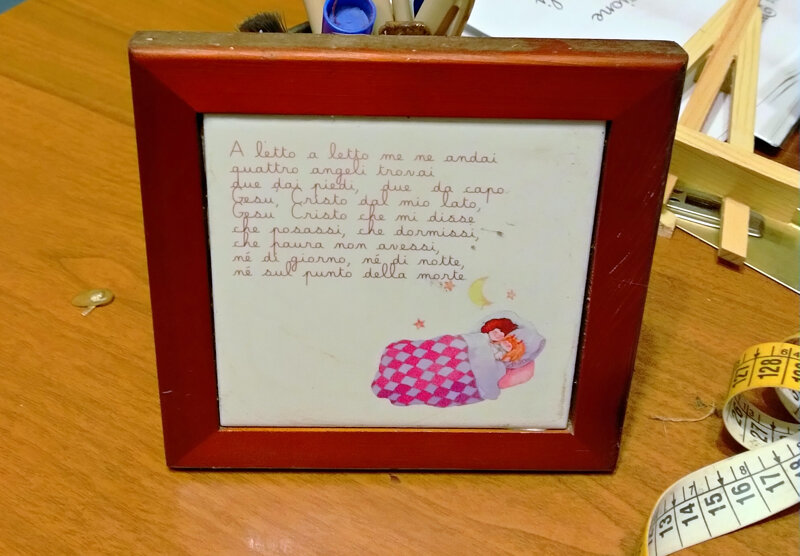 Stampa in ceramica 15x15cm incorniciata in legno. Filastrocca A letto a letto me ne andai.