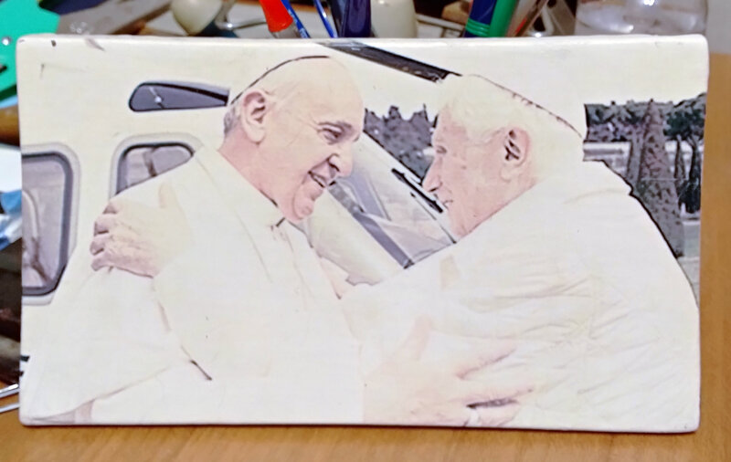 Stampa in cotto 22x13cm. dell'abbraccio tra Papa Francesco e Papa Benedetto