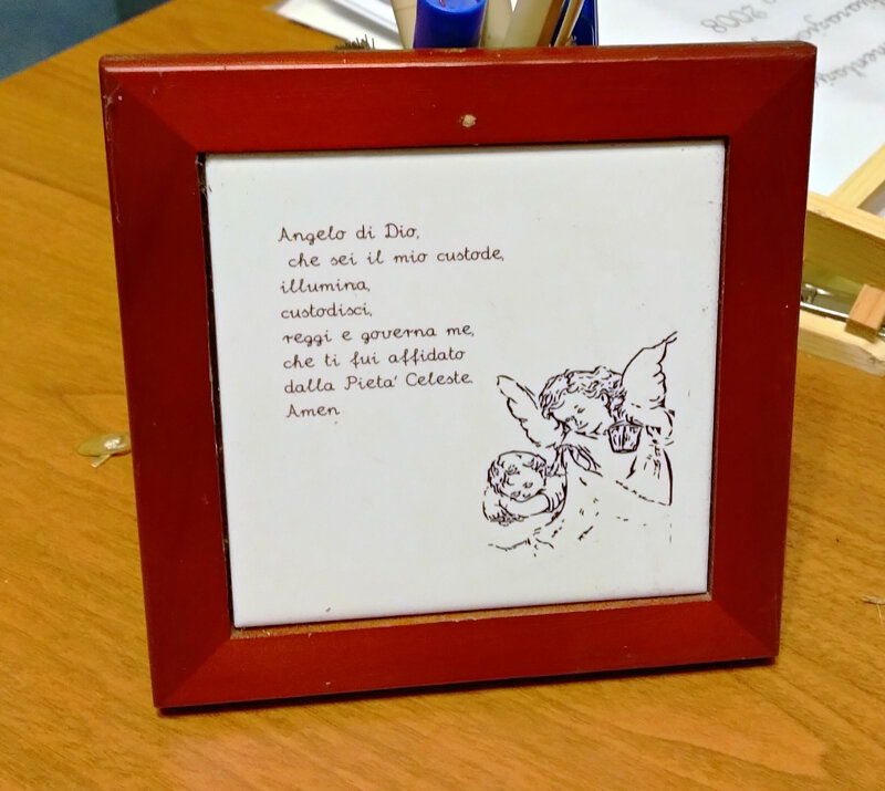 Preghiera all'angelo custode, stampa in ceramica 15x15cm. Incorniciata in legno