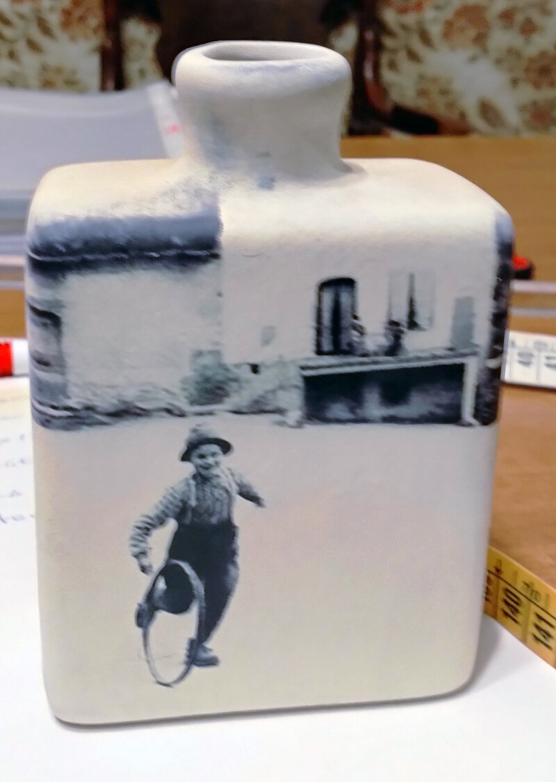 Bottiglia in cotto con stampa "i giochi di una volta" 10x13cm.
