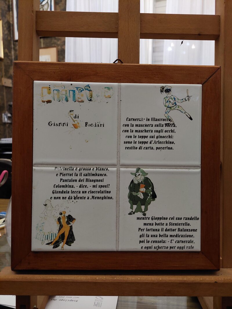 Composizione in ceramica della filastrocca Carnevale di Gianni Rodari illustrata e incorniciata in legno 24x24cm