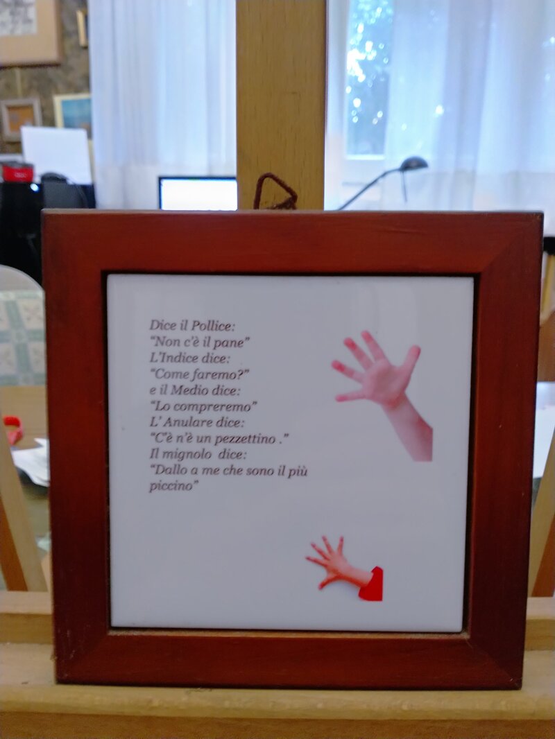 Stampa in ceramica di una filastrocca per bambini per imparare il nome delle dita. Incorniciata in legno 14x14cm.