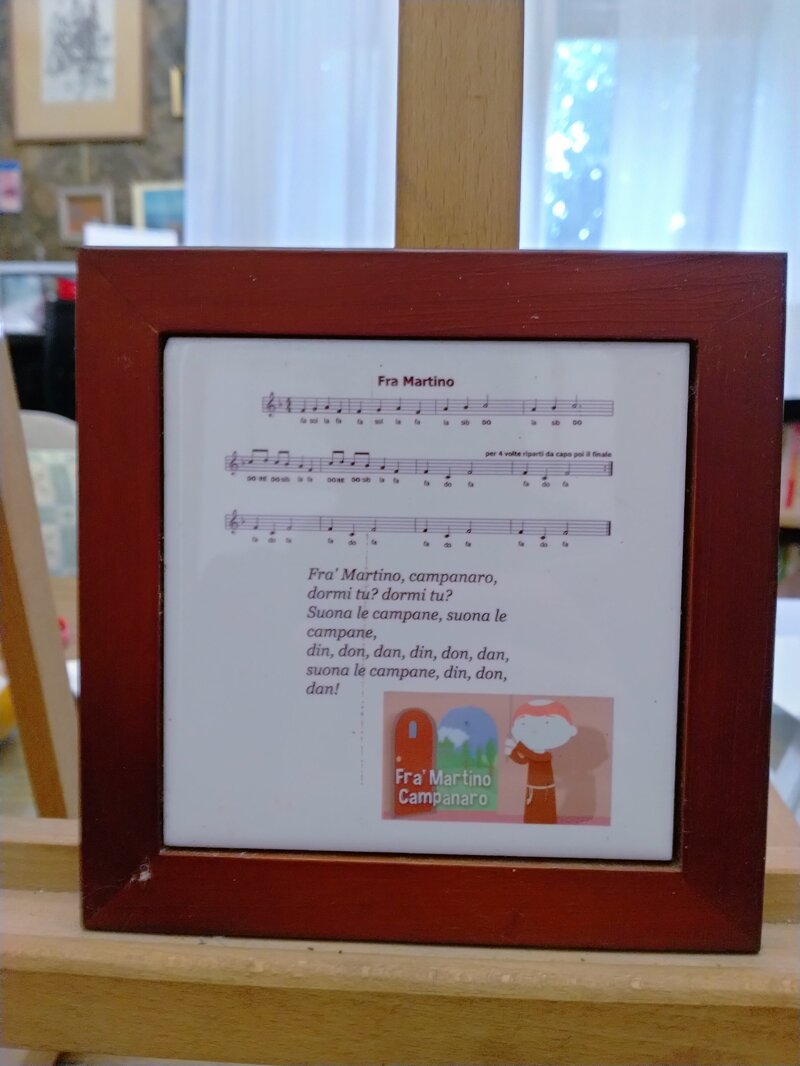 Stampa in ceramica, testo e musica con illustrazione della famosa canzoncina Fra Martino campanaro. Incorniciata in legno 14x14 cm.