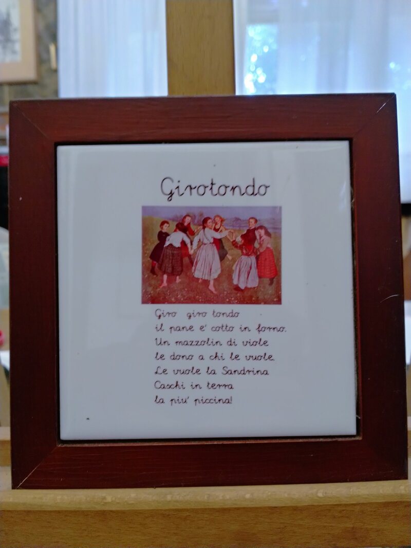 Stampa in ceramica illustrata del famoso " Giro giro tondo, il pane è cotto in forno" incorniciata in legno. 14x14cm.