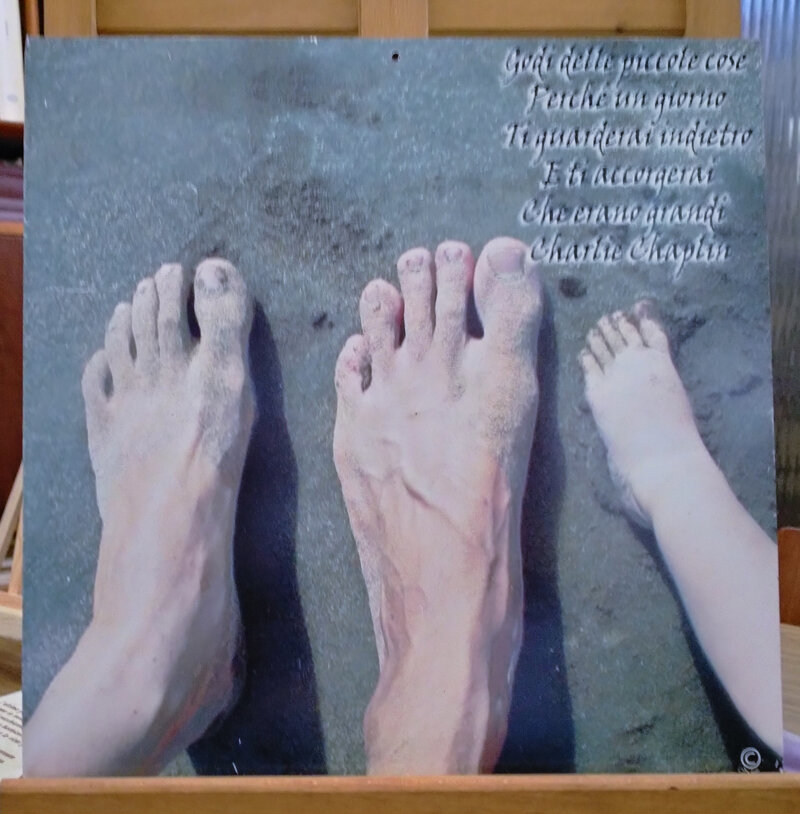 Piedi famiglia sulla sabbia con citazione di Charlie Chaplin
