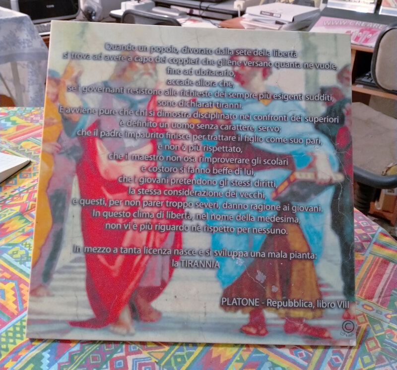Stampa su marmo de La Repubblica di Platone. Testo illustrato. 30x30cm.