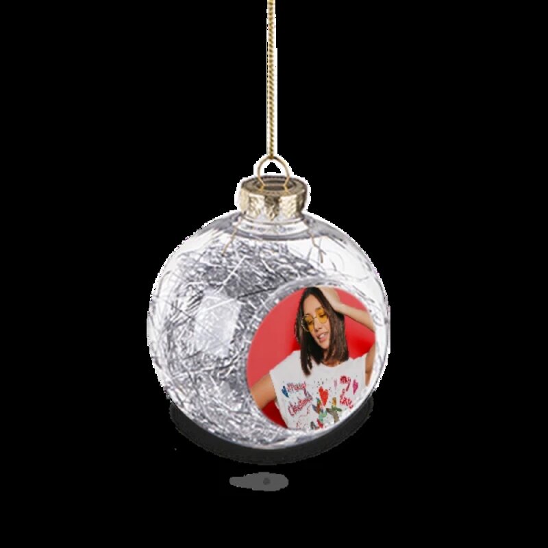 Palla di natale trasparente con inserto in alluminio ultrabrillante personalizzabile e con all'interno fili colorati.