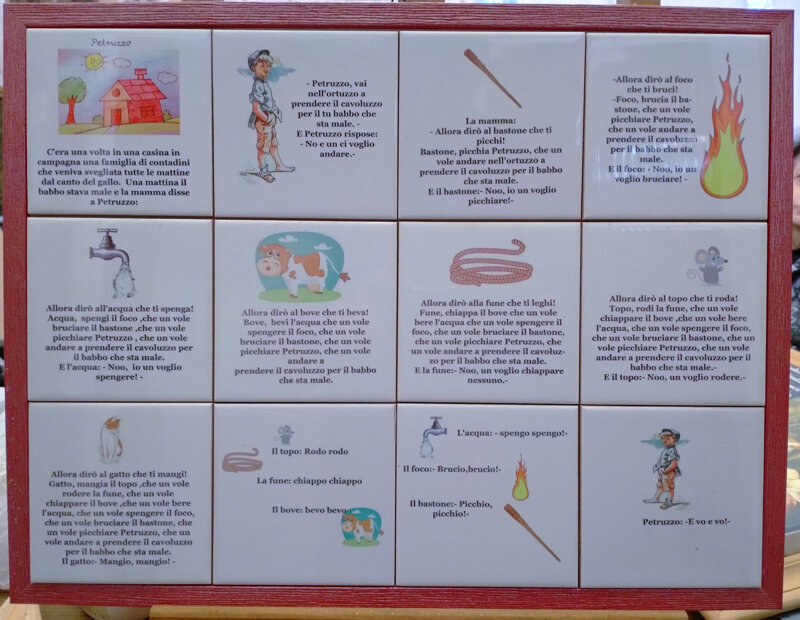Composizione in ceramica con cornice in legno rosso della serie "Le fiabe appese"