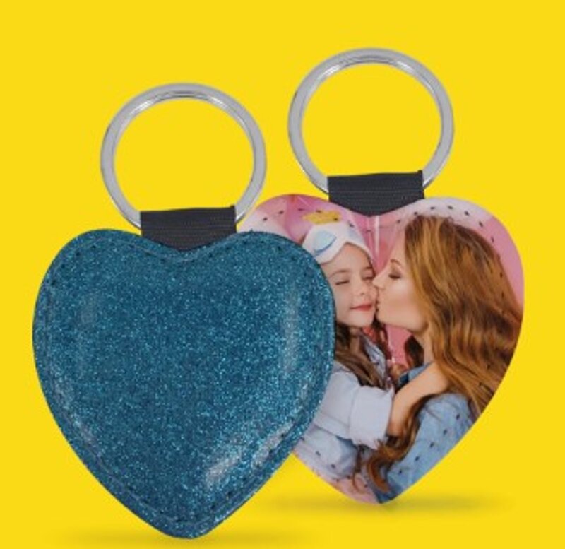 Portachiavi ultrabrillante e resistente con lato colorato glitterato e lato bianco personalizzabile.
