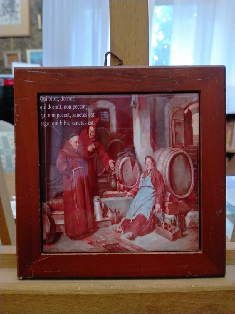 Stampa in ceramica con cornice in legno di uno spiritoso motto latino.