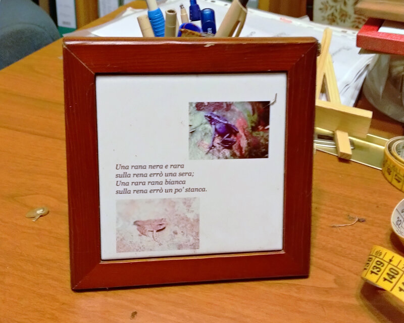 Scioglilingua "una rana nera" stampa su ceramica incorniciata in legno 15x15cm.