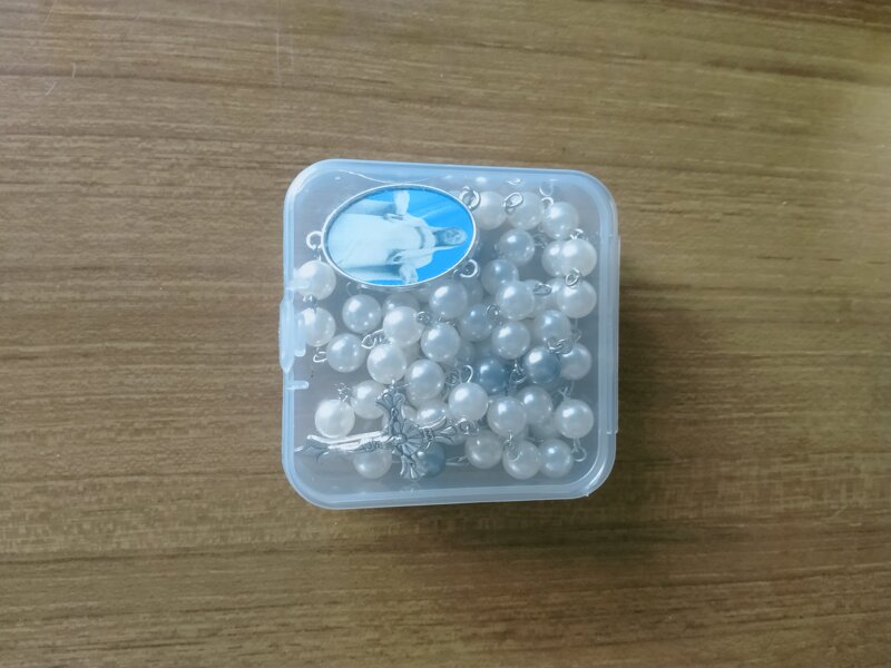 Catena rosario con perle in vario colore, bianco come in foto, rosso, azzurro...E medaglietta da personalizzare con l'immagine desiderata